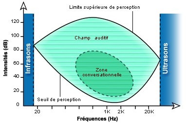 Nous qualifions d'infrasons toute fréquence inférieure à 20 Hz et d'ultrasons tout ce qui est au-delà de 20 kHz. L'homme ne peut pas percevoir les sons qui dépassent ces limites. Le schéma suivant nous montre le domaine de l'audible pour l'homme.